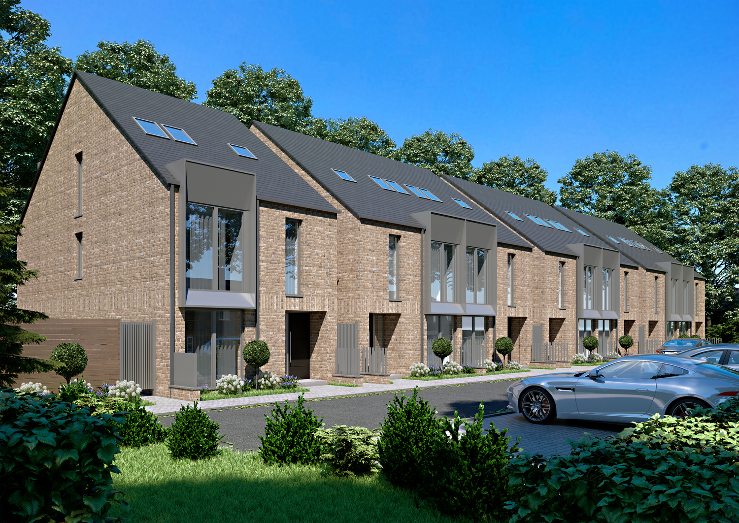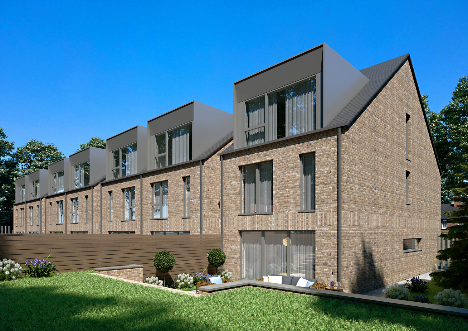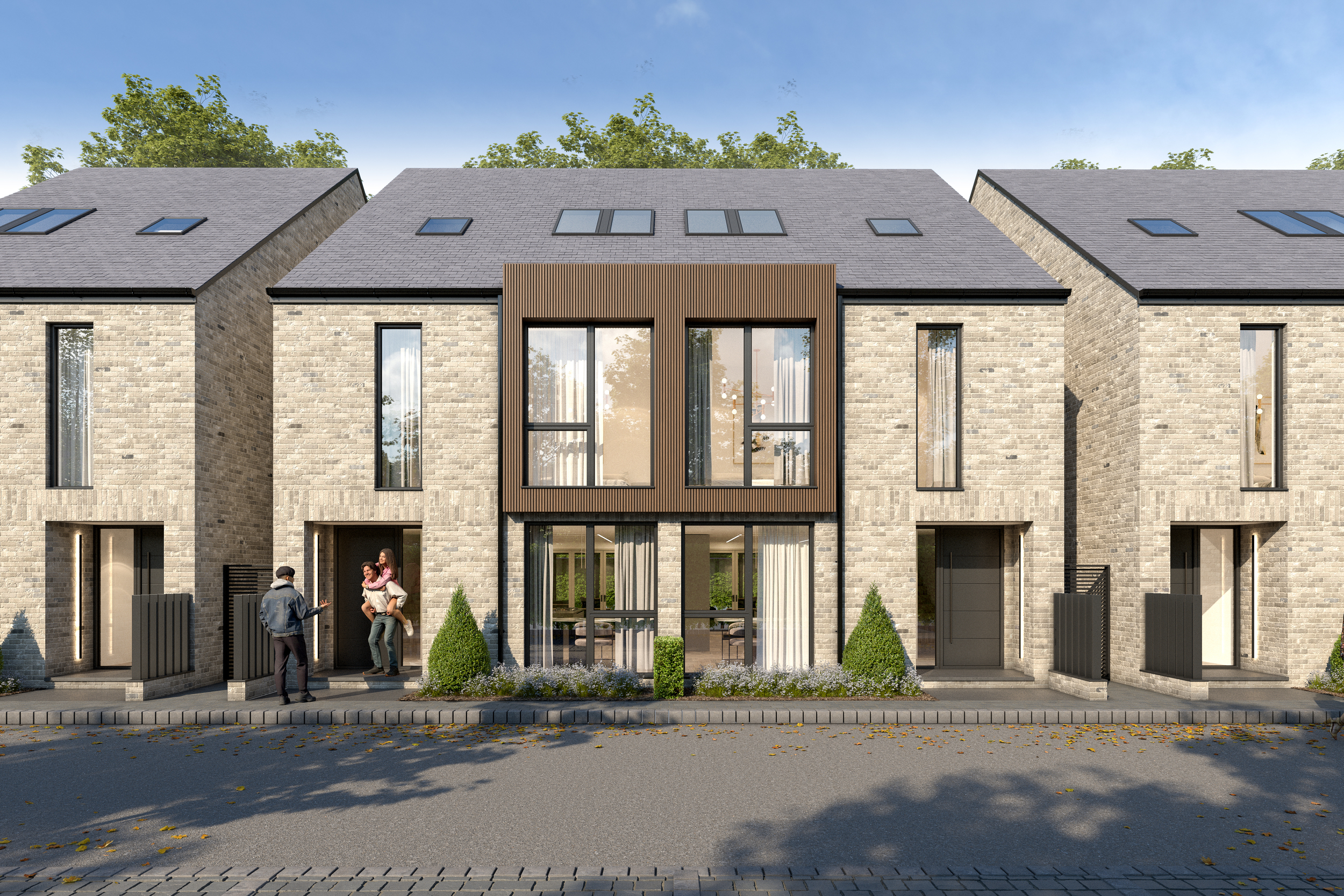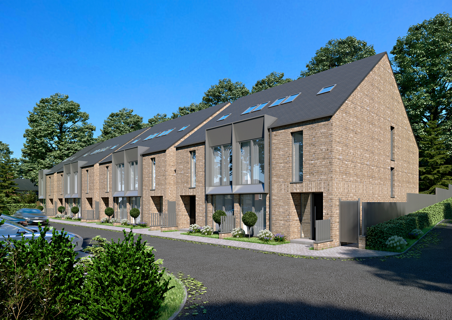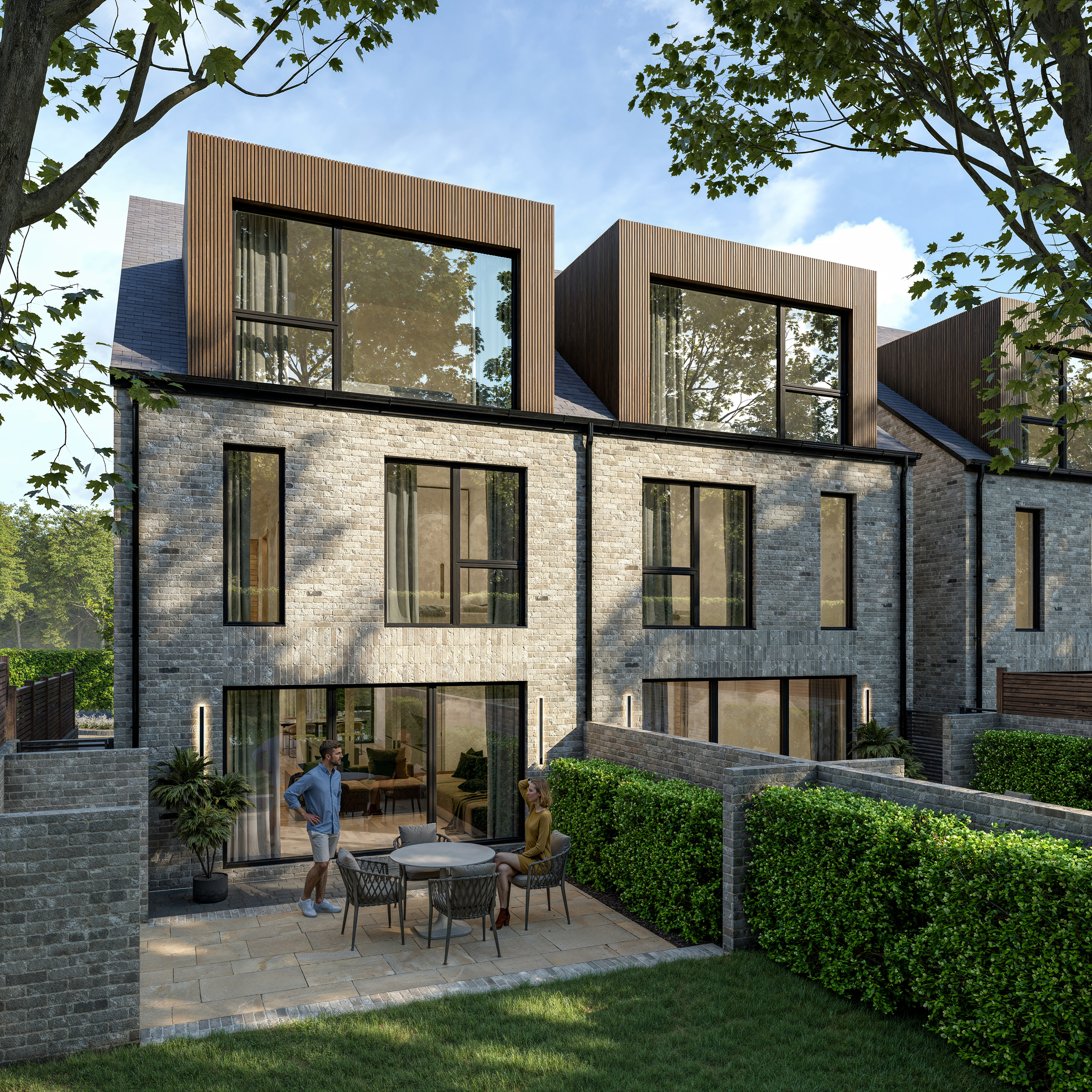 Elegant vertical proportions and the developments signature bay windows create sun-soaked living spaces and offer exceptional views out. Subtle details create a reassuring sense of privacy. The design employs a minimal palette of buff brick in traditional bong, large format aluminium windows, aluminium clad dormer elements and a slate roof.
