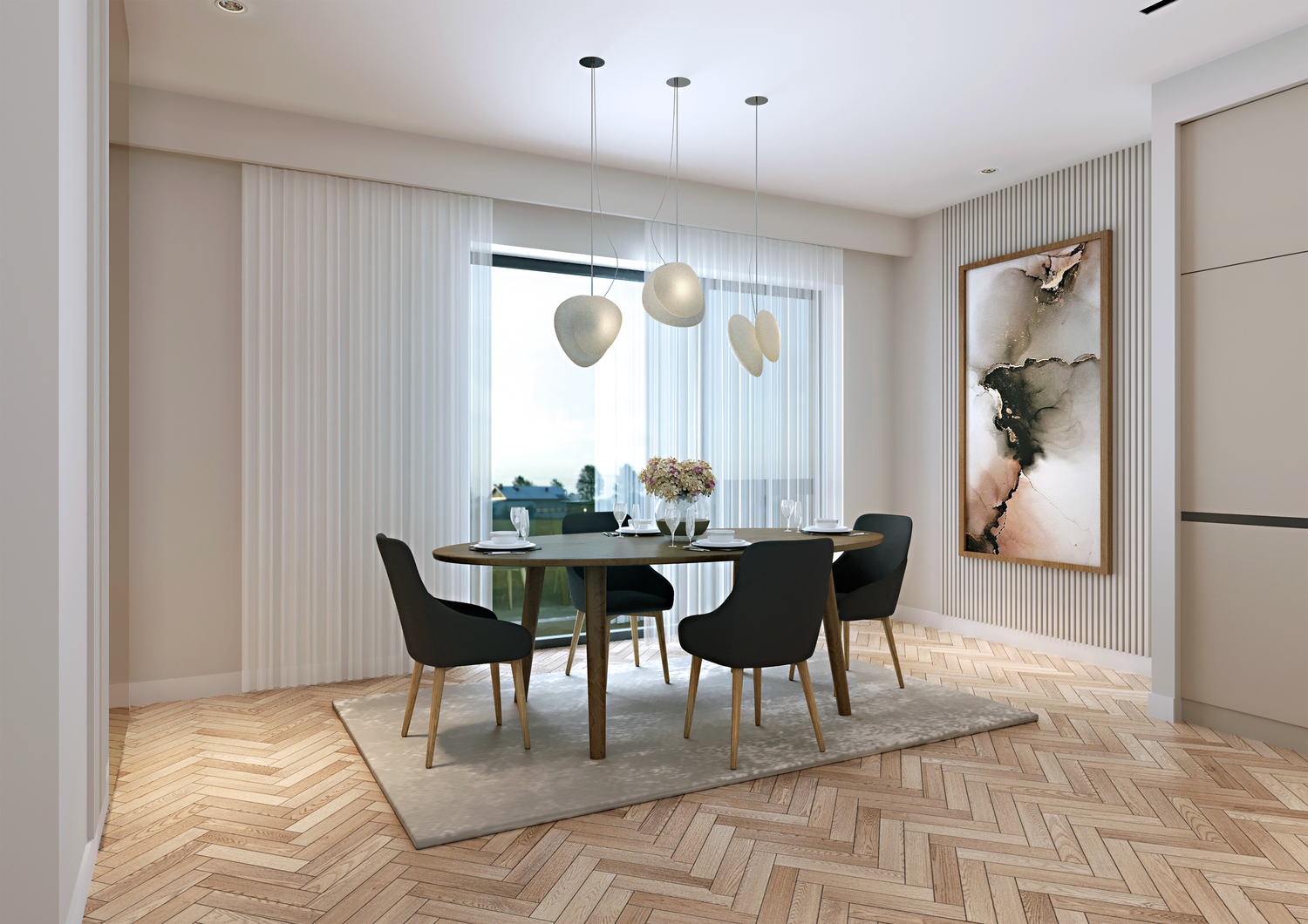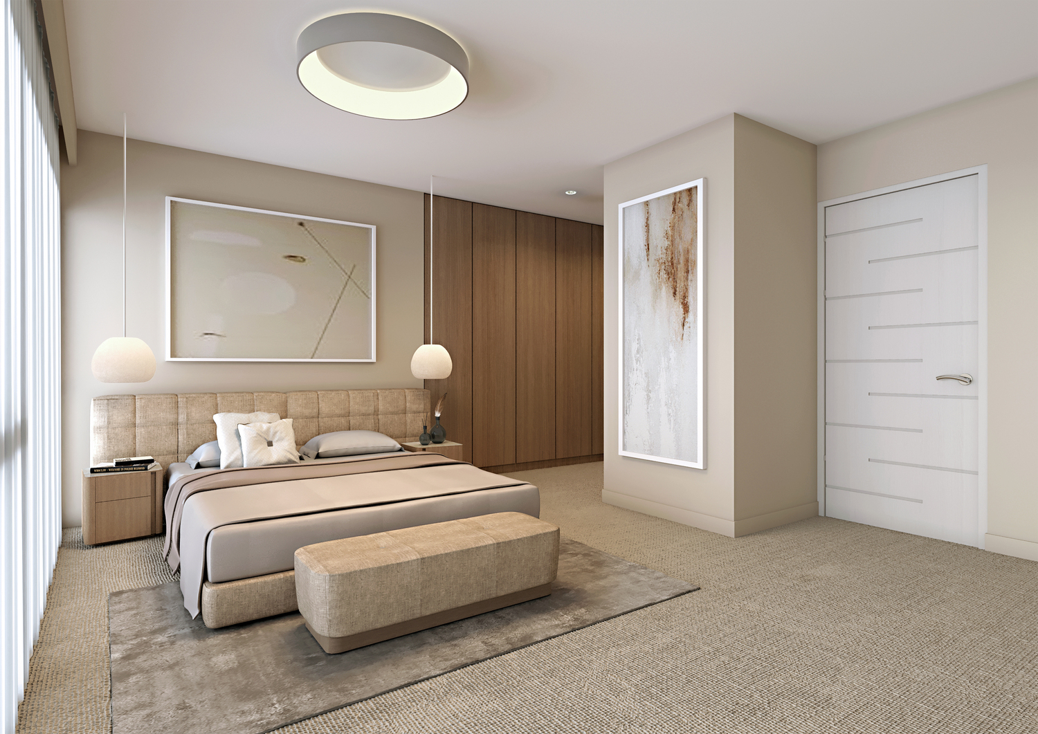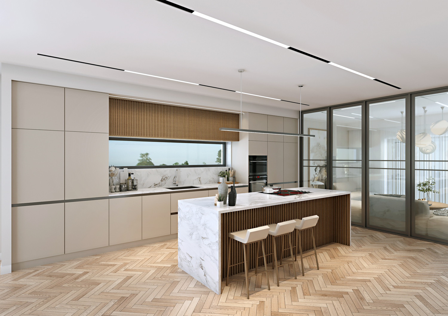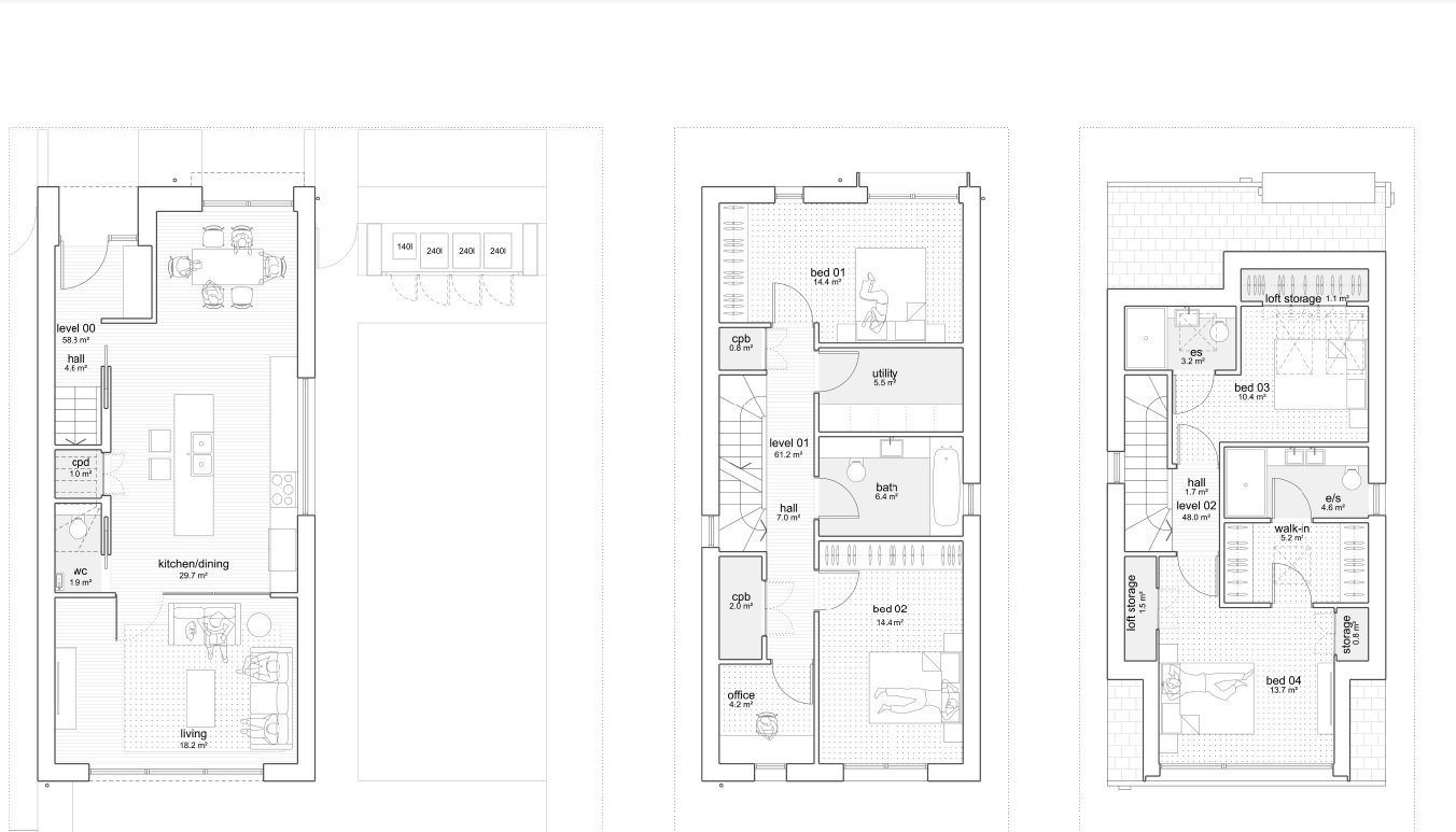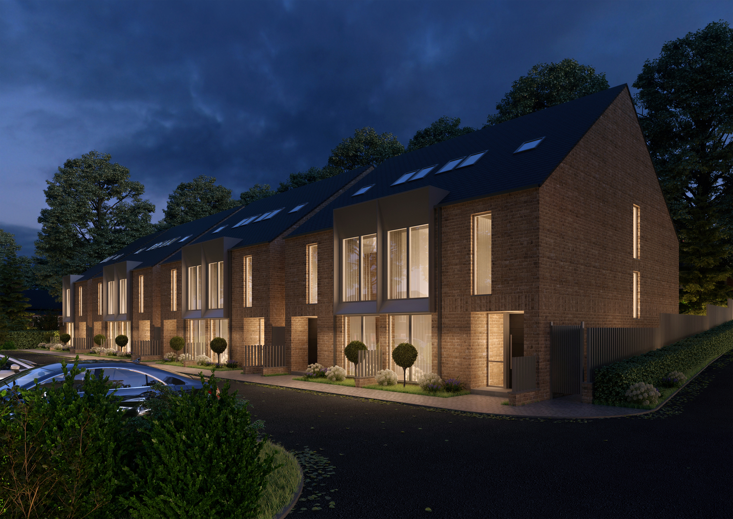 Elegant vertical proportions and the developments signature bay windows create sun-soaked living spaces and offer exceptional views out. Subtle details create a reassuring sense of privacy. The design employs a minimal palette of buff brick in traditional bong, large format aluminium windows, aluminium clad dormer elements and a slate roof.
